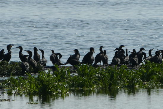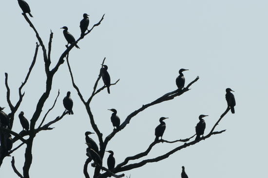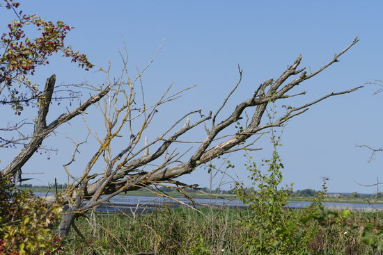 Nach unserem Frühstück mit Blick hinüber nach Usedom schnüren wir die Wanderschuhe und machen uns auf zu einer kleinen Wanderung ins Naturschutzgebiet. Nach einer Sturmflut 1995 brach ein Damm am Stettiner Haff und setzte hier eine große Fläche unter Wasser. Seitdem wird die Natur sich selbst überlassen und das dabei entstandene Moor- und Sumpfgebiet ist ein Refugium für Biber, Otter und zahlreiche (seltene) Vogelarten. Unter anderem lebt Deutschlands größte Kormoran-Kolonie hier. Nicht zu aller Freude. Die schwarzen Vögel hocken auf den abgestorbenen Bäumen und die Szenerie wäre fast schon gespenstisch, würde heute nicht eitel Sonnenschein und blauer Himmel herrschen. Wir müssen dennoch einige Male an Alfred Hitchcocks "Vögel" denken....