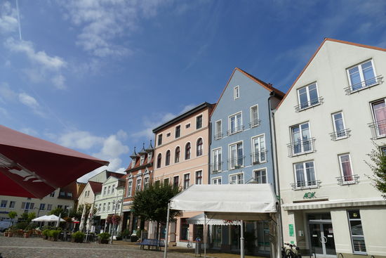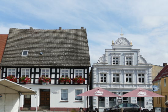 Wieder auf dem Boden der Realität gelandet machen wir den Mumin startklar und los geht es rund 40 Kilometer weiter nach Ueckermünde. Wir sind nun wieder am Stettiner Haff - nun jedoch auf der deutschen Seite. Die gemütliche Hafenstadt liegt nicht direkt am Haff sondern am Flüsschen Uecker. Wir finden einen Parkplatz am Omnibusbahnhof und machen uns zu Fuß auf den Weg in die nette Altstadt.