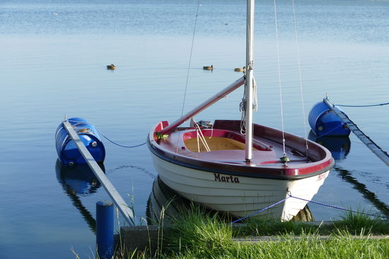 Aus unerfindlichen Gründen hatten wir heute eine unruhige Nacht. Also stehe ich schon kurz nach 6 Uhr auf und schiebe den gestern abend vorbereiteten Brotteig in den Ofen. Dann nochmal in die Federn geschlüpft und allmählich erfüllt der Duft von frischem Brot den Mumin. Das Geburtstagsfrühstück gibt es wieder draußen an unserem Logenplätzchen. Während sich die ersten Gratulanten melden geht Frank nochmals schwimmen. Er ist nicht alleine, denn schon gegen 7 Uhr morgens waren die ersten Schwimmer am Steg. Man stürzt sich hier im Adamskostüm in die 18 Grad kalten Fluten. Scheint wohl gesund zu sein und ich vermute fast, dass Kamp ein Dorf der Hundertjährigen ist.