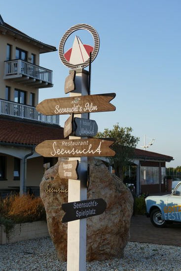 Nach einem kleinen Spaziergang und einem Hochzeitstag-Sekt machen wir uns auf den Weg ins Restaurant "Seensucht" an der Marina des Sees. Seit unserem ersten Besuch hier im Jahr 2010 hat sich einiges verändert. Die Marina ist gewachsen, die Bernstein-Villa (s.o.) ist ein Hotel geworden, es gibt eines kleine Siedlung mit nagelneuen Ferienhäusern und es entsteht gerade das Kaffeehaus "Wundermild", Bitterfelds erste Kaffeerösterei am See.