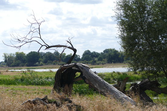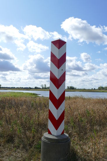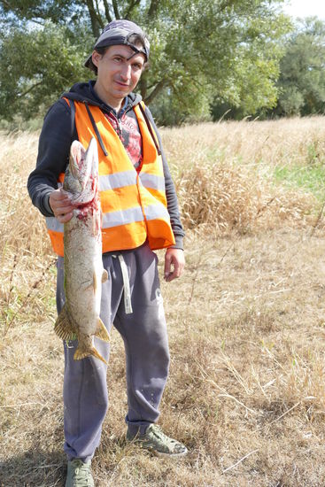 Nach dem Frühstück wappnen wir uns gegen den kühlen Wind und marschieren mit unserem Vierbeiner ein Stück entlang der Oder. Dabei treffen wir auf einen jungen Mann, der einen kapitalen Fisch (Hecht???) am Haken hat. Vier Kilogramm dürfte das Monstrum haben, meint der Petrijünger. Trotz des Anglerglücks hat er ein "kleines" Problem. Er ist auf der Suche nach seinem Fahrrad, das er gestern Abend nach einem Zechgelage, wie er selbst zugibt, irgendwo im Schilf deponiert hat. Wir helfen dem guten Mann ein wenig bei seiner Suche. Der arme Junge vermutet bereits, dass ihm "bad people" den Drahtesel geklaut haben. Ist ja mal kein gutes Zeugnis für seine Landsleute. Wir überlassen ihn seinem Schicksal, denn in Zeiten von I-Phone & Co. findet er einen Shuttle-Service für sich und seinen Hecht.
