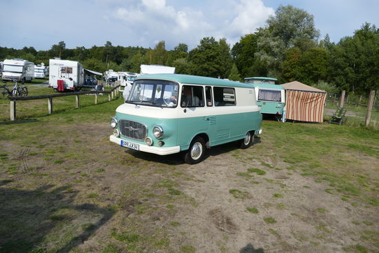 Wir müssen unseren Mumin quer über das Gelände chauffieren und schrecken damit die Campergemeinde aus dem wohlverdienten Nachmittagsschlaf. Alles steht da und guckt. Dabei sind wir nicht die einzigen Exoten hier. Um uns herum sind noch ein paar Kuriositäten zu bestaunen.