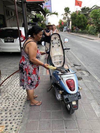 Da wir erst ab morgen das Zimmer auf der Insel haben erkunden wir noch Seminyak. Schnell im Hotel Grand Belisana Suites einchecken, eine Massage buchen, die Überfahrt zur Insel buchen, 2 Roller buchen und das Zimmer im 4. Stock ohne Lift, dafür mit Meersicht beziehen.