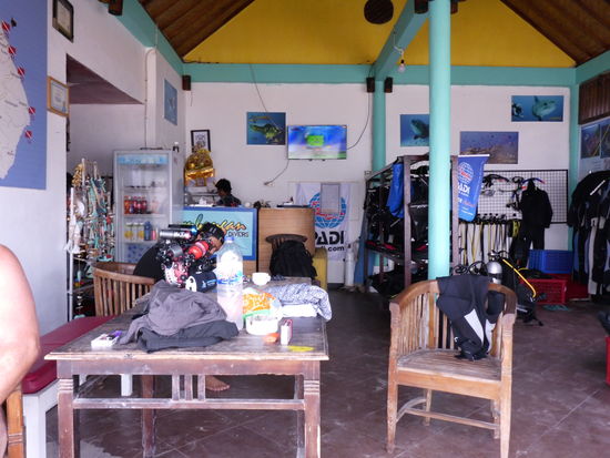 Wir wollen erst mal was trinken gehen und die Situation überdenken, wie geht es nun weiter? Das sehen wir das Schild von Lembongan Dive, fragen kostet nichts. Im Laden sitzen nur Einheimische, welche anscheinend gerade so gar nichts zu tun haben. Wir fragen mal, Anang will wissen wann wir das letzte mal getaucht sind, will unseren Dive-Ausweis sehen, das wars. Ja, wir können morgen tauchen, schnell ist das Formular ausgefüllt und eine Anzahlung hinterlegt, Equipment (schon ältere Neoprenanzüge aber Brand neue BCD) zusammenstellen und gut ist. Wir strahlen uns ungläubig an, juhu, wir gehen tauchen.