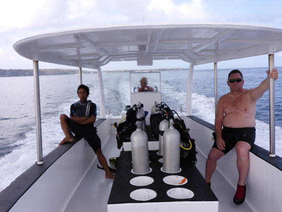 Pünktlich treffe wir nach einem kurzen Frühstück, das wieder einmal wegen der Nervosität spartanisch ausfällt im Divecenter ein. Unsere Sachen stehen säuberlich vorbereitet bereit, wir erhalten ein Briefing und dann geht es auch schon los. 2 Tauchgänge sind geplant. Nach 25 Minuten Bootsfahrt gibt es erneut ein Briefing, sehr ausführlich und professionell, was meine ersten Bedenken zerstreut. Wir sind die einzigen Gäste an Bord, was alles noch gemütlicher und irgendwie auch exclusiv macht, sehen wir doch Boote mit 12 und mehr Tauchern.