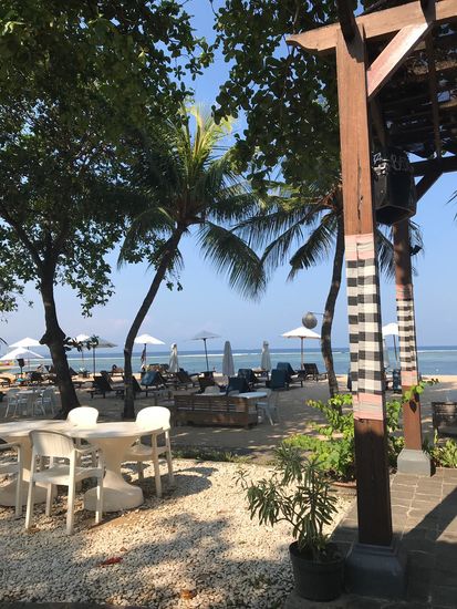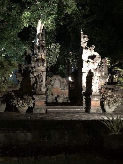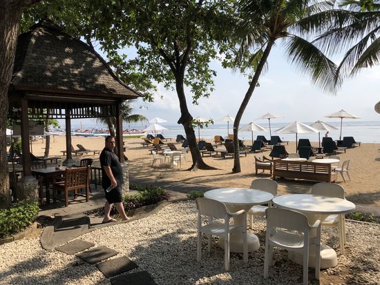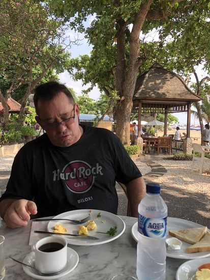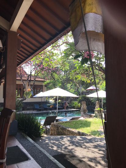 Das reichhaltige Frühstück ist nichts für unsere Mägen, Nudeln und Reis gehen heute noch gar nicht. Aber das Omlett ist lecker und es hat ja Toast, Konfitüre und Früchte. Dann darf ich den ersten balinesischen Kaffee geniessen, mit anschliessendem Kaffeesatz deuten. Wir beobachten das Personal, welches mit den Opfergaben auf dem Weg zu den Göttern ist. Der Zauber in Verbinung mit der leisen Musik im Hintergrund nimmt uns langsam gefangen.