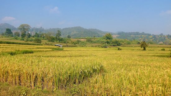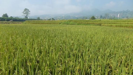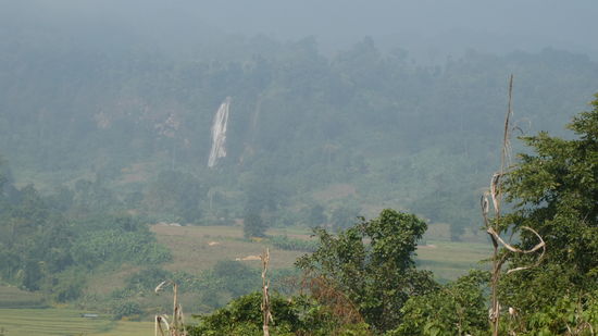 Vorbei an wunderschönen Reisfeldern, aus der Ferne der Wasserfall zu sehen.