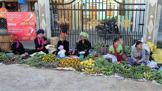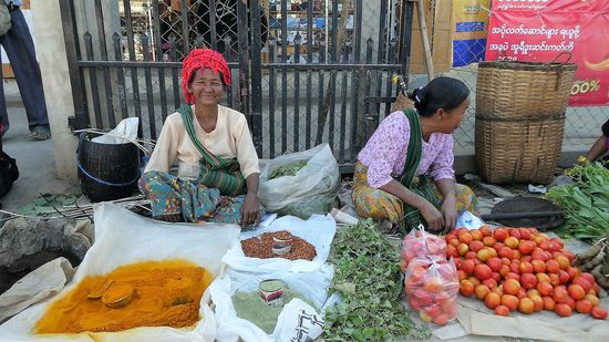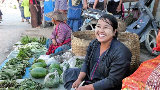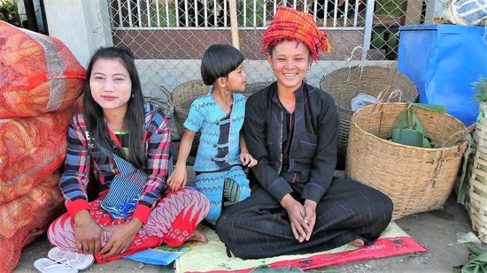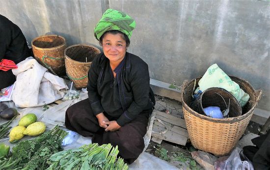 Zum Schluß noch auf einem der 5 Tage Wochenmärkte. Jeden tag ist woanders Wochenmarkt, um das gerecht zu verteilen. Diesmal finder der Markt in Ham Si statt und Man sieht viele Frauen vom Volk der Pa O. Man erkennt sie an der dunklen Kleidung und an den bunten Tüchern, meistens sogar Handtücher auf dem Kopf. Häufig in rot, aber auch grün und blau.