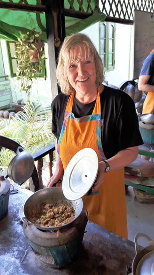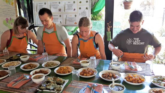 jeder suchte sich 2 Gerichte aus und dann gings los. Unter Leslies Anleitung schnibbeln und brutzeln wir, mörsern, und rühren.