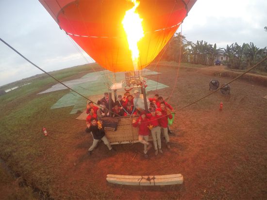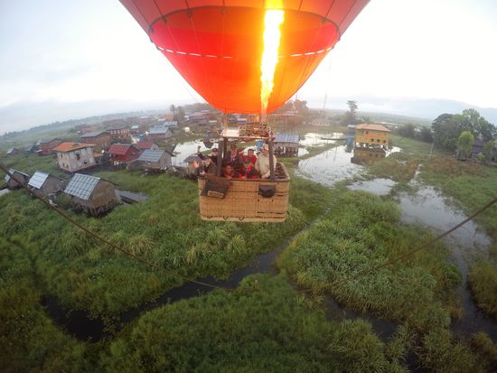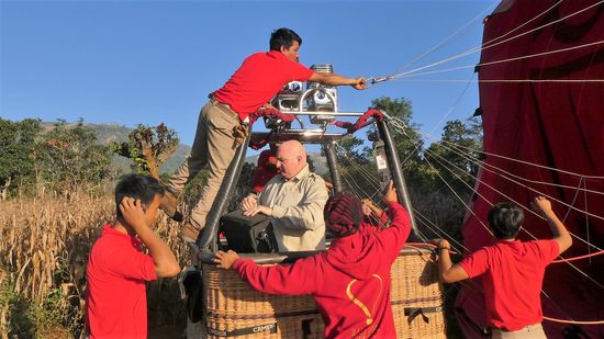 Wir sind die einzigen Fluggäste - und der einzige Ballon. Im Gegensatz zu Bagan, wo gleichzeitig so viele Ballone in die Lüfte gegangen sind.. Dafür erhalten wir ungeteilte Aufmerksamkeit.