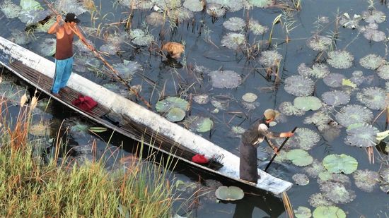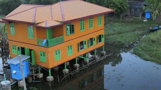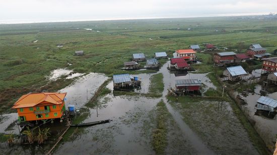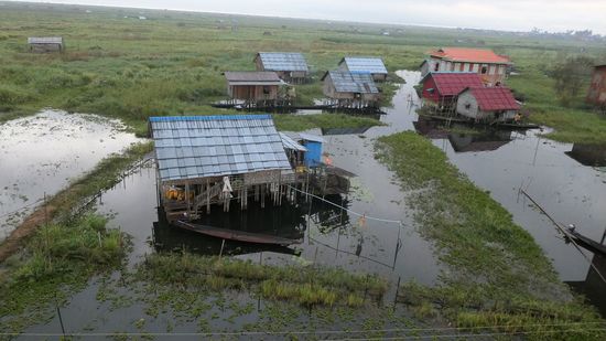 Wir schweben über die Häusereines schwimmenden Dorfes, für die Menschen ist es immer noch ein besonderer Anblick und alle schauen zu.