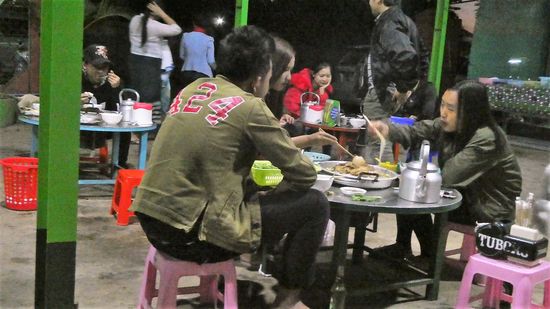 so ähnlich wie ein Raclette. In die Mitte kommt ein Topf mit Kohle. Das Essen sucht man sich vorher aus. Huhn, Schwein und jede Menge unbekanntes Gemüse.