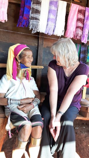 Die Longnecklady erzählt, das sie ihren Schmuck das letzte Mal vor 30 Jahren abgelegt habe, als sie Probleme am Kopf hatte.
