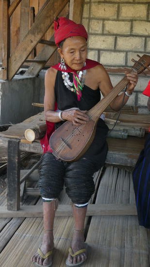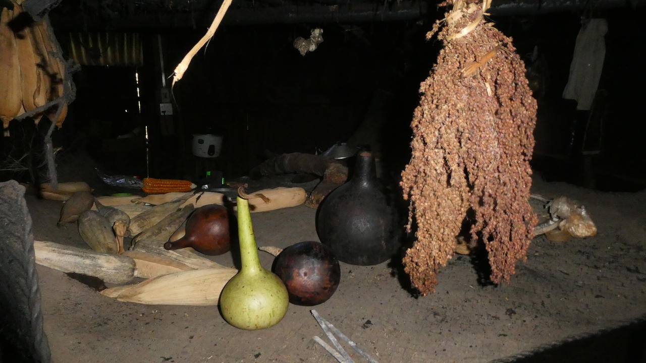 Die Frau des 2. Hauses zeigt uns ihr Haus von innen. Dort hängen etliche Instrumente, manche davon werden nur bei Zeremonien gespielt, oder bei Beerdigungen. Sie spielt uns ein Ständchen auf der Gitarre, und ich zeige ihr dann ein Video mit meiner Sambaband. Wieder ein Anlass zum herzlichen Lachen. Ihre Melodien waren doch sehr viel leiser und vermutlich in ihren Ohren harmonischer.