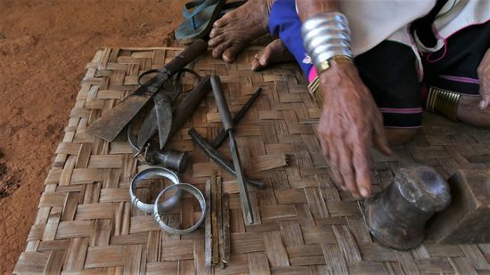 Sie zeigt uns dann, wie sie Schmuck herstellt. Armreifen und Halsreifen aus Aluminium und Messing