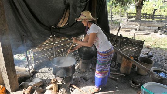 Wir schauen beim Reisschnapsbrennen zu. Meine Führerin war enttäuscht, das sie ihre mitgebrachten Flaschen nicht mit Nachschub füllen könnte. Der nächste Kessel war erst in Arbeit. Der Absatz ist sehr gut und die Vorbestellungen reichlich.