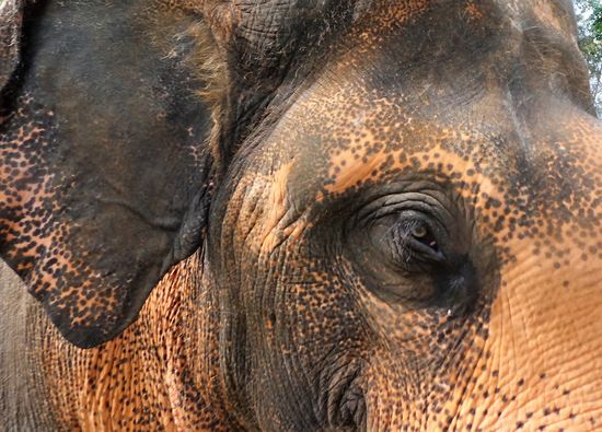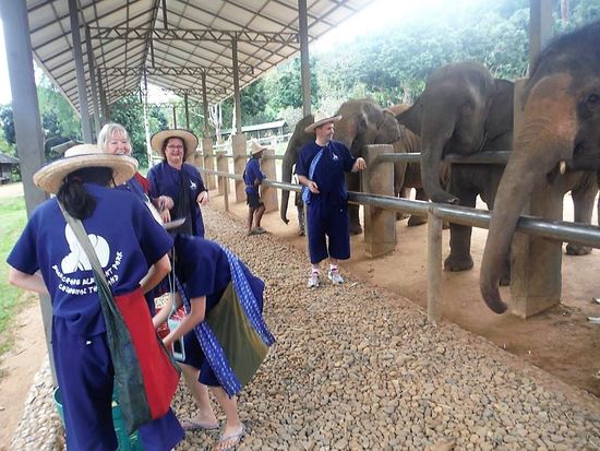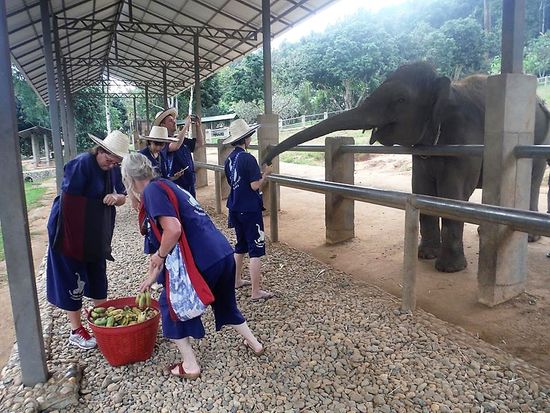 Die Elefanten sind in einem Gehege, also nicht freilaufend oder gar angekettet. Unser Guide erklärt. Naturreservat heisst nicht, die Elefanten sind in Freiheit wie z.B. im Krüger Nationalpark, sondern in einem eingezäunten Gelände. Da sie jeden tag ein 10. ihres Körpergewichtes fressen, und einen Radius von 10 km haben, würden sie kurzerhand das gesamte Gebiet um das Reservat kahl fressen. Da hätten dann die Bauern keine Freude daran. Und so werden sie in den Teil des Reservates geführt mit den Touristen, wo sie sich frei bewegen dürfen.