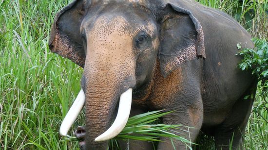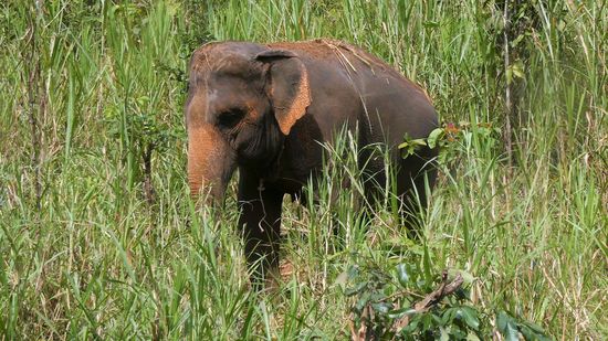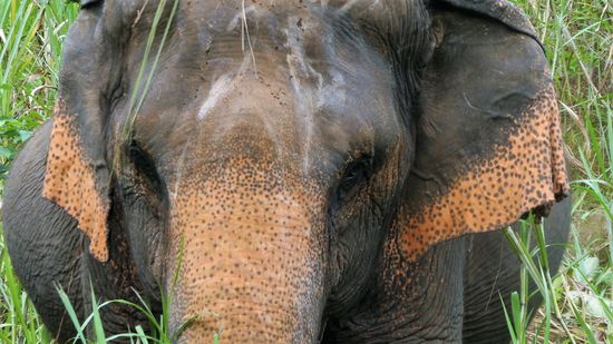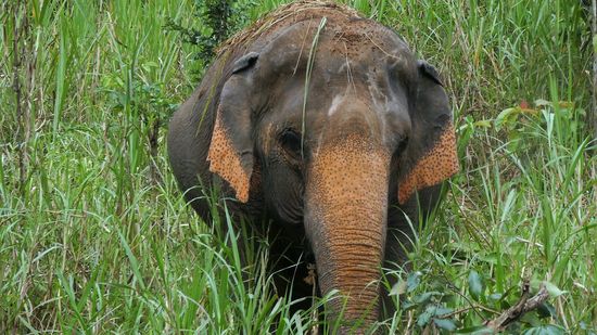 Am Wegrand wird immer wieder genascht, und angekommen im Reservatgebiet (vorher sind wir durch fremdes Land gezogen) dürfen die Elefanten dann weiter frei laufen und fressen.