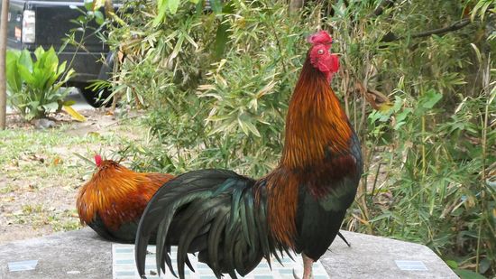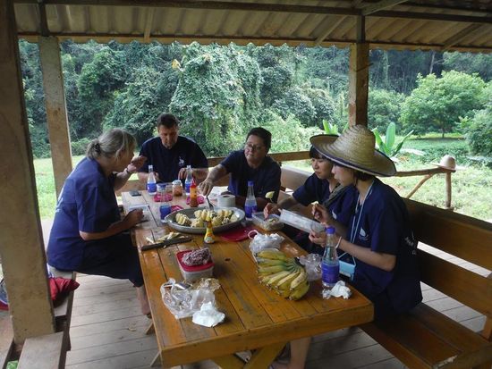 Da stehen sie, bzw. sie kommen uns entgegen, als sie die Körbe sehen, die wir mitschleppen. Wir sind schmuddelgerecht gekleidet. Auf den Strohhut habe ich wieder dankend verzichtet. Wir sind eingedeckt mit Bananenstauden, jede Menge. Und offensichtlich sind wir schon hungrig erwartet worden