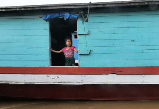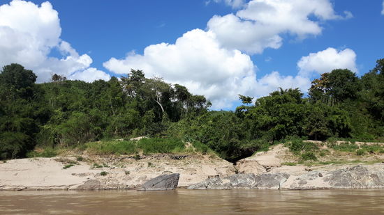 Man sieht ganz gut, wie hoch das Wasser zur Regenzeit steht. Jetzt ist der Wasserstand tief, und der Schiffer muß viele Untiefen und Steine umschiffen.