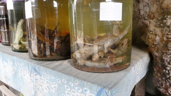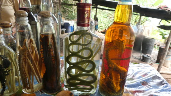 Halt in Lao Lao Village. Hier kann man Lao Whiskey und Reisschnaps kaufen. Mit allerlei Ungeziefer drin. Das soll angeblich positive Effekte auf die Gesundheit haben.