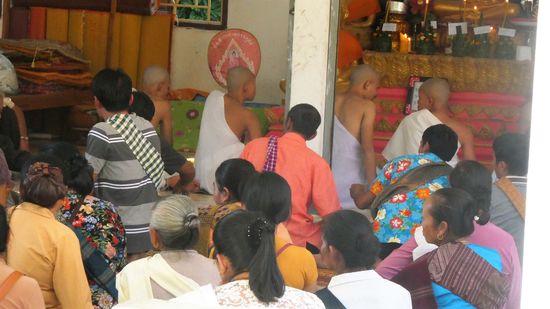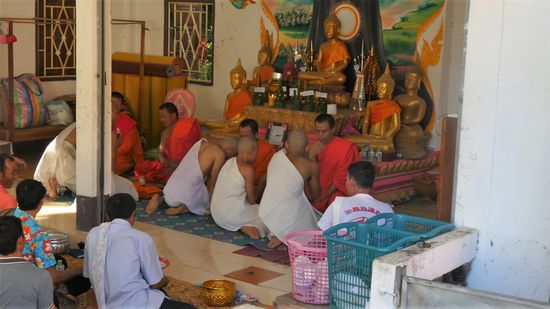 im Dorf findet gerade eine Zeremonie statt, wo Novizen zu Mönchen geweiht werden, ihre orangfarbene Kutte bekommen.
