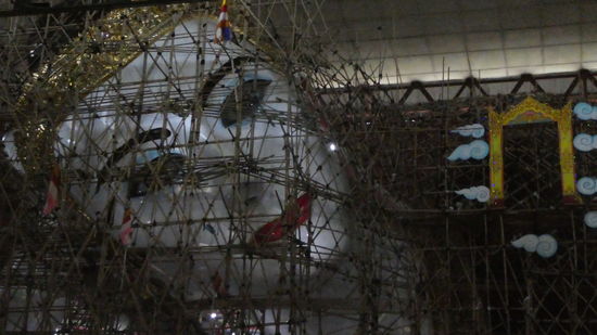Heute zum liegenden Buddha, der leider völlig eingerüstet ist. Hingebungsvoll arbeiten einige Männer und streichen sein Kleid neu an.