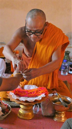 ein Mönch, der gegen kleines Geld ein Bändchen um das Handgelenk bindet, und Gebete für den Menschen ausspricht