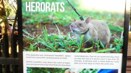Eine Ratte braucht für ein Gebiet von der Größe eines Tennisplatzes ungefähr 30 Minuten, während ein Minensucher mit einem Metalldedektor ca. 4 Tage dafür braucht.