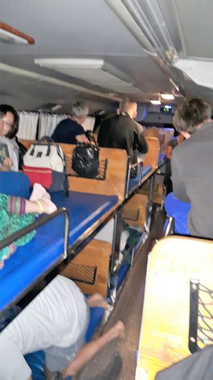 Dieses Mal habe ich einen Bus ergattert der auch Einzelliegen hat. Deutlich angenehmer, als so engen Raum mit einer völlig fremden Person zu teilen. Schlafen ist dennoch nicht besser, es rumpelt von einer Seite zur anderen. Die Straßen sind halt einfach anders als bei uns.
