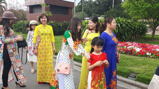 nach den in Schlafanzügen gekleidete Frauen in Kambodscha jetzt hier in Hanoi wunderschön anzusehende Frauen. Der krasse Gegensatz. Lange Kleider mit Schlitzen bis zur Taille und darunter lange Hosen.