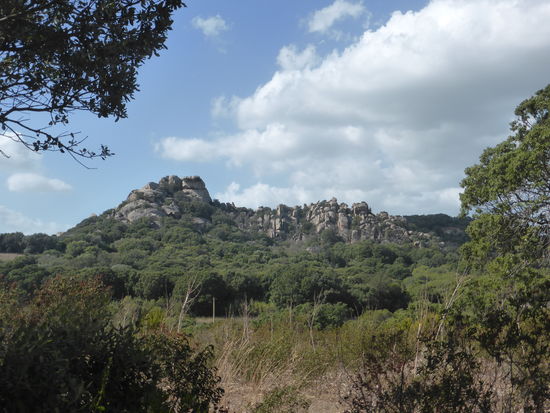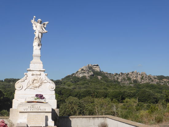 Kirche von Caldarello - davor typische 'Sarggebäude' eines Friedhofes - und weit dahinter die ersten Felsformationen des korsischen Südens
