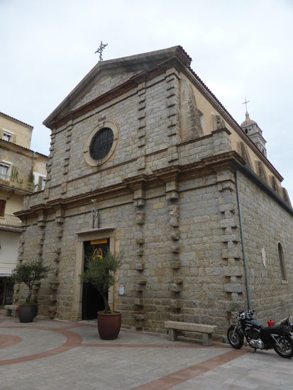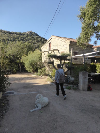 Die Wetterapp verheißt nichts Gutes: Trotzdem wollen wir heute unsere Absicht Port Veccio zu besuchen verwirklichen. Auf dem Weg dorthin machen wir einzigen winzigen Abstecher zur Kapelle San Quilicu de Montilati. Sie stammt zwar aus dem 12. Jh. ist aber so schlicht, dass man sie eigentlich nicht gesehen haben muß. Der große weiße Hund davor ist nur mäßig an uns interessiert und döst sofort weiter.