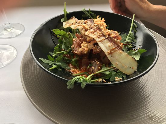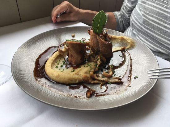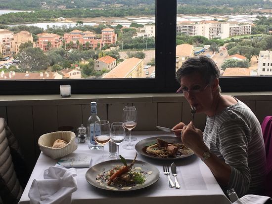 Daher gehen wir ins l’Antigu und bekommen den Platz, den wir uns vorher schon ausgesucht hatten, mit Blick auf den Hafen und die Salinen. Vom Menü wählen wir alle vier Angebote: Auberginen confitesà La Brousse (Ziegenkäse) Pesto/ Tartare de Thon Rouge, panzetta (Schinken) gaspacho de poivrons mariné/ Dos de rascasse purée de celerie, Creme d’asparges/ Filet mignons de Port, jambon et Tomé Corse) dazu einen Lokalen Rosé und nachher einen Kaffee. (27€ le Menü, 19€ le vin)