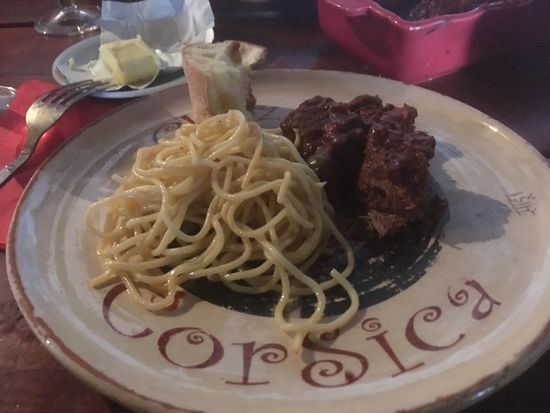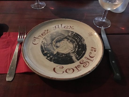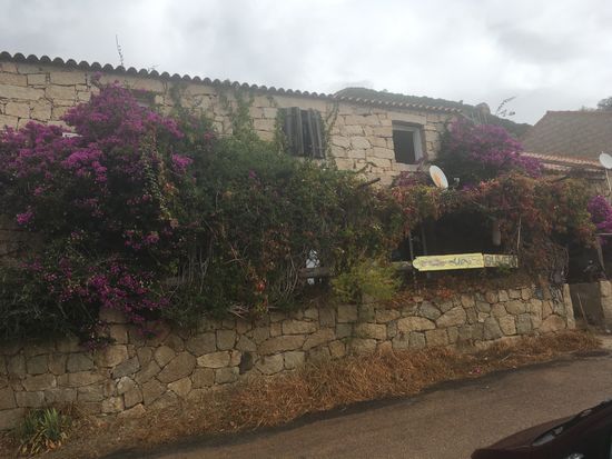 Nun wollen wir den Omu Di Cagna sehen; dazu fahren wir über Monacia d’Aullène in die Bergregion, kehren aber unverrichteter Dinge um, da wir zweieinhalb Stunden (bei unsicherem Wetter ) hätten laufen müssen, um den ominösen Stein (der Mann von Cagna) zu sehen. ( 400 t auf einem Quadratmeter) . In Monacia weist ein Schild auf ‚Chez Alex‘, wir fahren mal hin und Ulrike schaut sich den heruntergekommenen Laden mal an.
