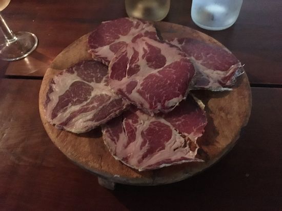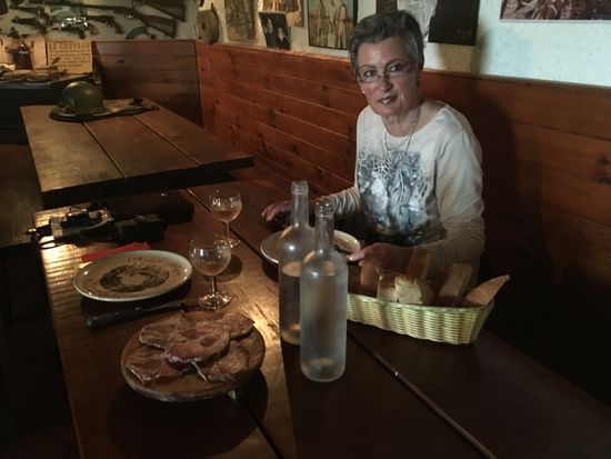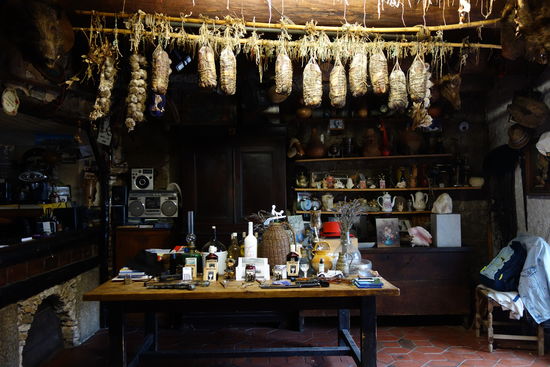Sie winkt mich rein und Alex begrüßt mich herzlich in seinem Reich von Gerümpel und Coppawürsten. Einfach urig, wir entschließen uns zu bleiben und erhalten ein 4-Gänge-Menü bestehend aus Maisbrot mit Coppa, Kalbragout mit Oliven und Spaghetti, Melone mit hausgemachter Feigenmarmelade und Kuchen mit einem Kastanienlikör. Alex hört zum ersten Mal von Feigensenf und muß sich sofort zwei Rezepte von uns aufschreiben. Er erzählt viel, auch wer schon alles Berühmtes bei ihm war, angefangen vom kanadischen Präsidenten und Mr. Hermės, was er selbst alles gemacht hat usw. Am Ende löhnen wir 60€ incl. einer Flasche Wein und Kaffee für das beste Essen unserer Reise.