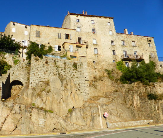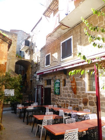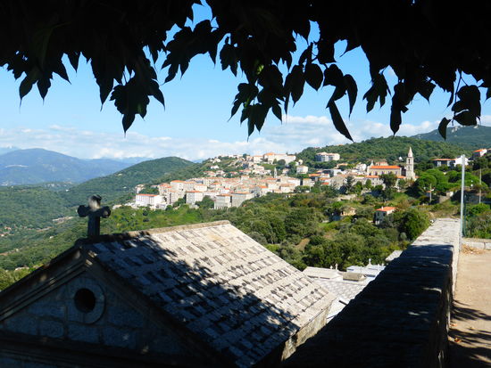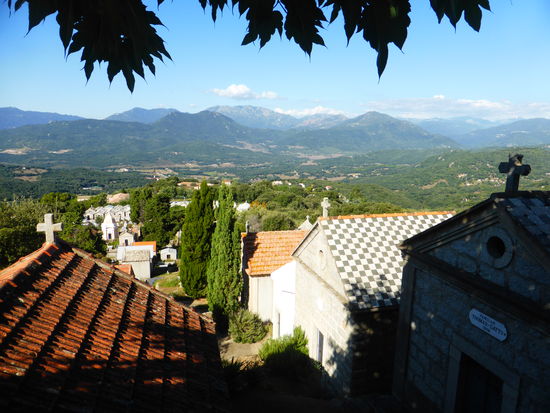 Inzwischen ist es schon 14.30 Uhr und es gab noch nichts Eßbares. Dafür sind aber bereits beide Flaschen Wasser nahezu geleert. Ein Schwarzbrot mit Mortadella und Kaffee aus unserer bewährten Thermoskanne hilft da an einem schattigen Plätzchen. Die Fahrt nach Sartène ist nicht lang und bietet auf dem Weg tolle Ausblicke auf die korsischste Stadt Korsikas, wie sie ein Reiseführer beschreibt, da es wohl nirgendwohin sonst so viele von den typischen Bruchsteinhäusern mit kleinen Fenstern gibt wie hier.