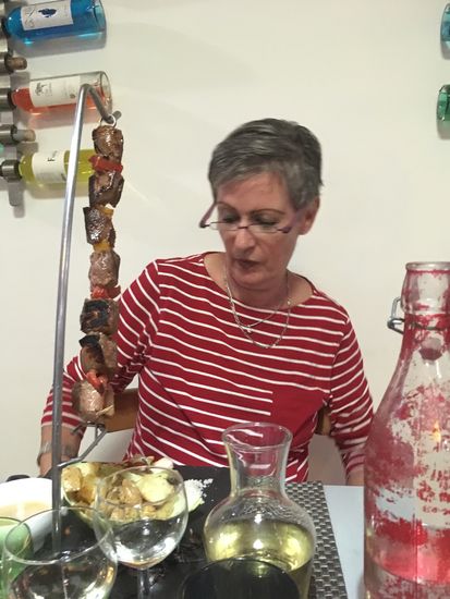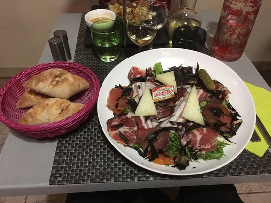 Nach intensiver Suche ( die ganze Küste südlich unseres Domizils ist bereits im Winterschlaf – nur ein Mann mit Gewehr und Hund läuft umher und scheint die Wildschweine zu suchen, die Ulrike die Straße hat entlang laufen sehen) landen wir schließlich in Pianottoli bei Chez Felix. Ulrike nimmt einen Spieß von der Entenbrust und ich einen korsischen Salat. Der Pichet Weißwein mündet hervorragend nach den Orgien in Wasser; das Wasser aus der caraffe d’Eau schmeckt zumindest am Anfang stark nach Chlor, ist nachher aber genießbar.