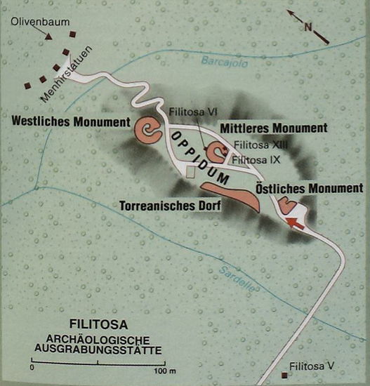 Das Museum - Im archäologischen Dokumentationszentrum sind Fundstücke der Ausgrabungen mit Erklärungen ausgestellt. Vor allem drei restaurierte Fragmente von Menhirstatuen sind bemerkenswert: links am Eingang das Oberteil der Scalsa-Murta (1400-l350v.Chr.), die vorne einen senkrechten Speer trägt und am Rücken einen Zickzackpanzer sowie einen Helm mit zwei Einbuchtungen; die These, dort seien Büffelhörner aufgesetzt worden, wird heute angezweifelt. Etwas welter steht die längs geteilte Fllltosa XII, von der der linke Arm zu sehen Ist; dahinter befindet sich Tappa II mit einer archaischen Kopfdarstellung.