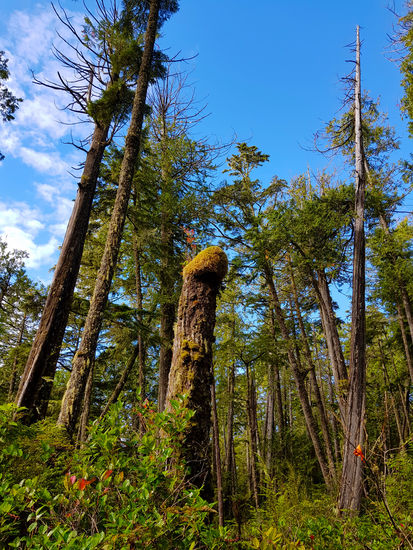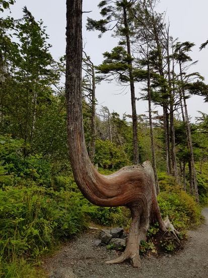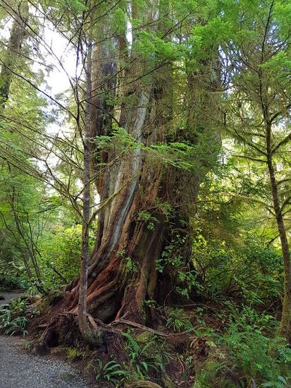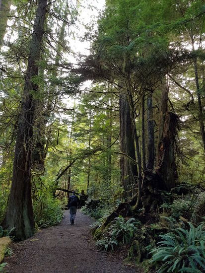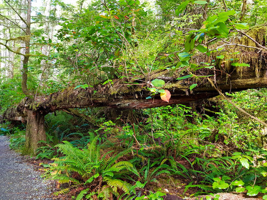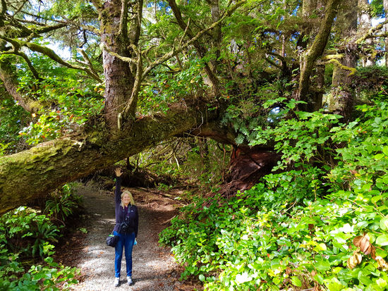 Frühstück gibt es auf dem Zimmer, dann fahren wir zum Ausgangspunkt des Ancient Cedars Trails. Dort parken wir das Auto und laufen los. Wieder öffnet sich der wunderbare Regenwald. Gleich am Anfang stehen wieder tolle Riesenbäume.
