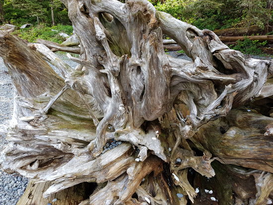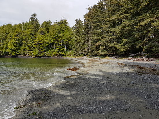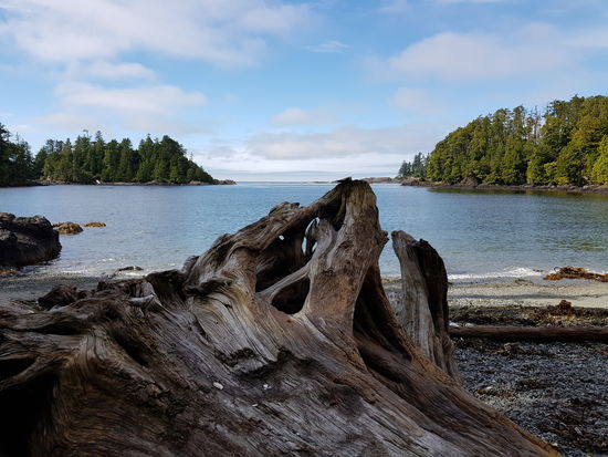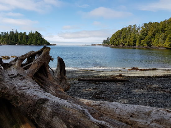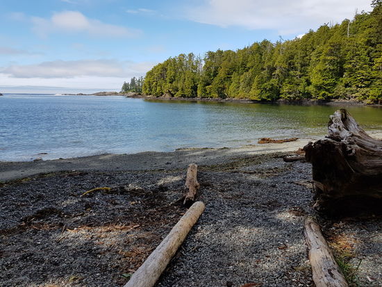 Dann geht es weiter zum Terrace Beach, wo wir alleine sind. Völlig ungewohnt in diesem Urlaub... Ein wenig Treibholz liegt am kleinen Kiesstrand.