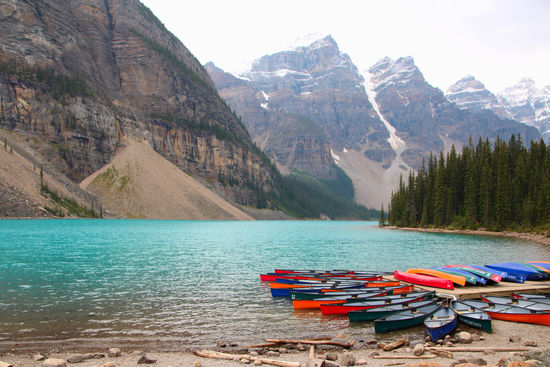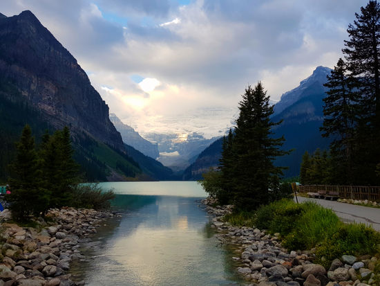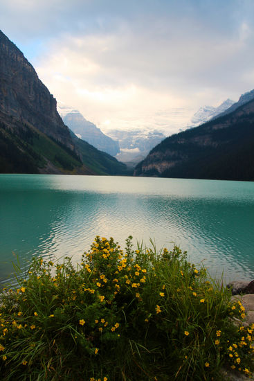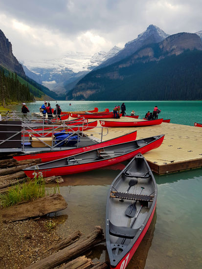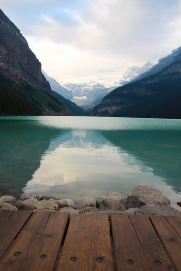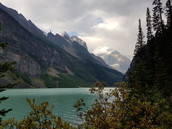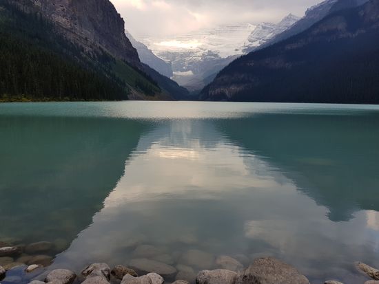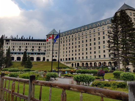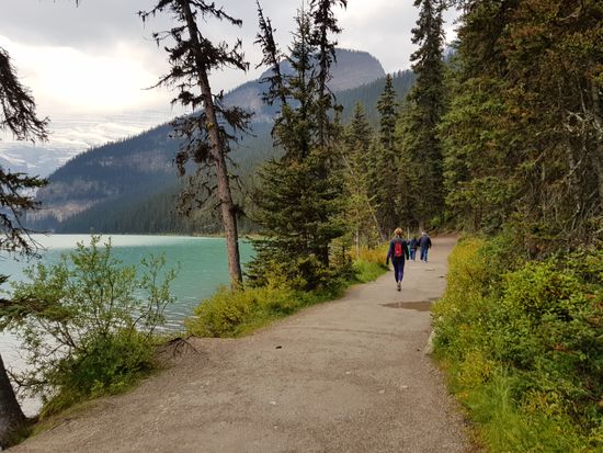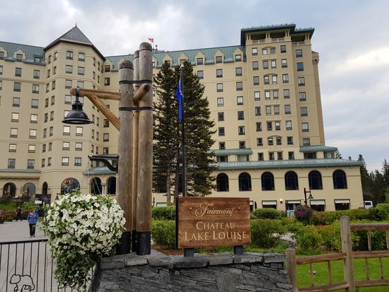 Der Regen hat aufgehört. Dafür ist es eiskalt! Nur 2 Grad! Wir frühstücken rustikal, reichhaltig und nicht gerade preiswert im Hotel und gehen dann zu Fuß zum Lake Louise. Schon um 8.30 Uhr sind hier Massen an Menschen. Die Sonne schickt nur ein paar einzelne Strahlen, so dass der See nur wenig blau leuchtet.