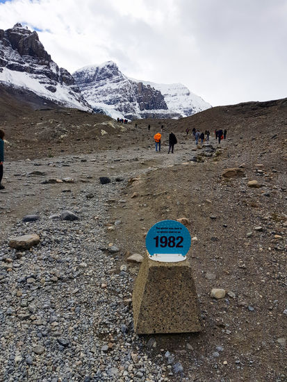 Schon jetzt schockieren uns Anzeigetafeln, auf denen der Rückgang des Gletschers im Laufe der Jahre dokumentiert wird.