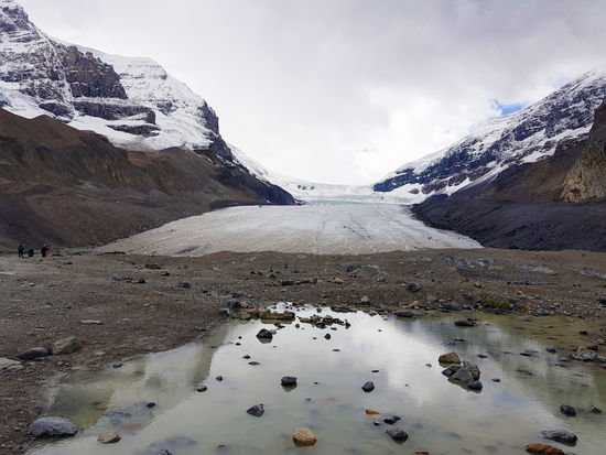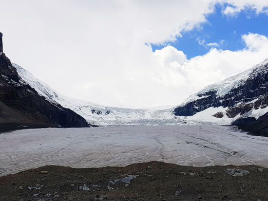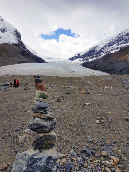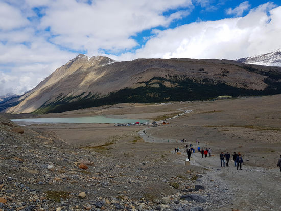 Am Icefield Center halten wir auf dem gegenüberliegenden Parkplatz und fotografieren den Athabasca Gletscher. Wir finden einen näher gelegenen Parkplatz am Fuße des Aufstiegs. Eine Bustour auf den Gletscher machen wir bewusst nicht. Durch die Busse, die direkt aufs Eis fahren, leidet der tauende Gletscher noch mehr!