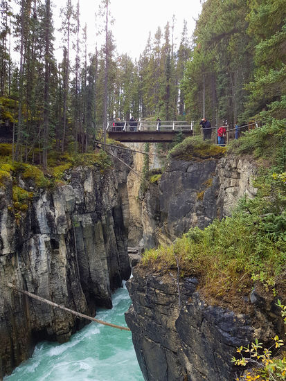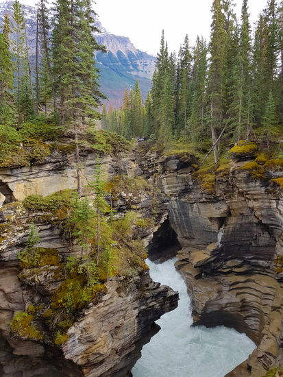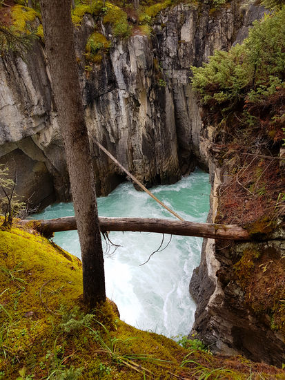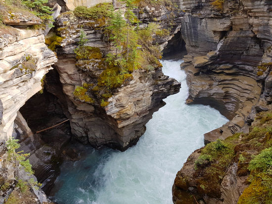 Nächster Halt: Sunwapta Falls. Hier donnert der Sunwapta River durch eine enge Schlucht. Man muss über ein paar Wurzeln steil nach unten klettern, um noch schönere Fotos zu bekommen.