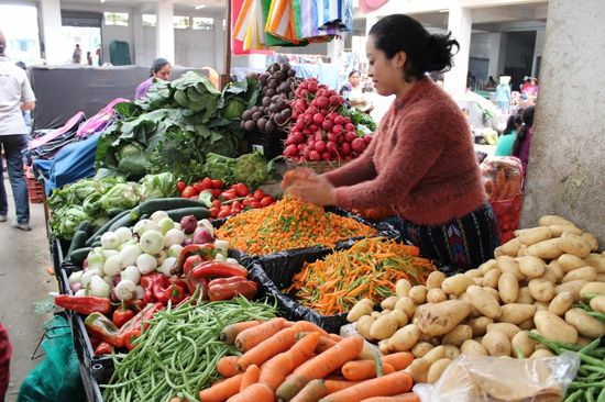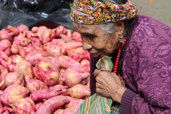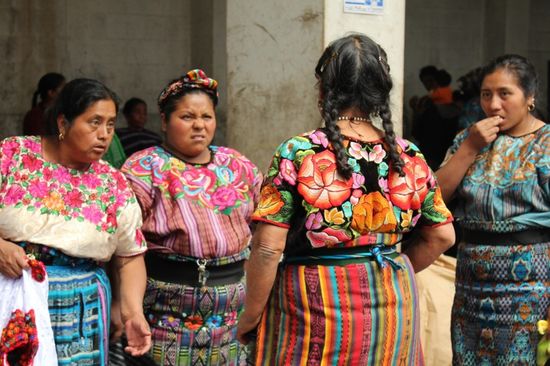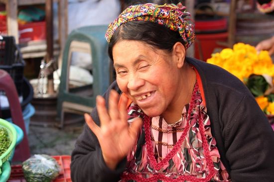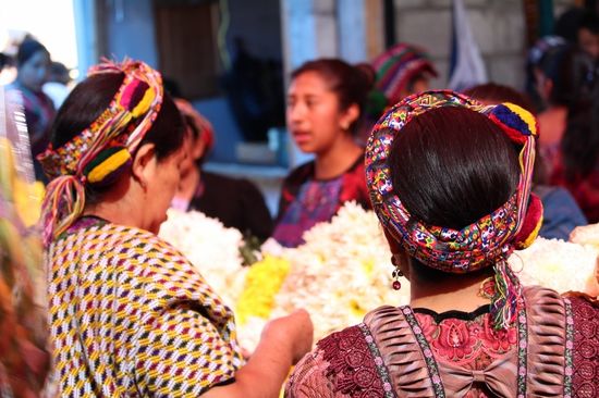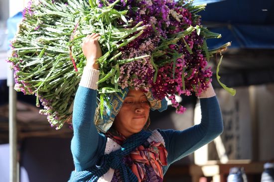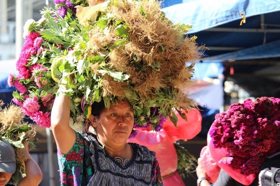 Inder Nähe von Quetzaltenango, in Almolonga gibt es einen Gemüse-Grossmarkt. Hierher kommen Händler auch aus dem Ausland, um Gemüse aus dem Hochland einzukaufen. Dieser markt ist heute unsere ziel. Allerdings werden heute vor allem Blumen angeboten, denn diese werden heute und morgen zum Schmücken der Gräber benötigt. Viele gelbe und weisse Chrisanthemen, dunkelrote samtene exotische Blüten, grüne Palmblätter, vereinzelte rote Rosen und ganz viele farbige Blätter. Es herrscht ein unglauliches Gedränge. Frauen hocken auf dem Boden hinter Bergen von Blumen. Andere balancieren ihre Einkäufe auf dem Kopf und schreiten durch das Gewusel.