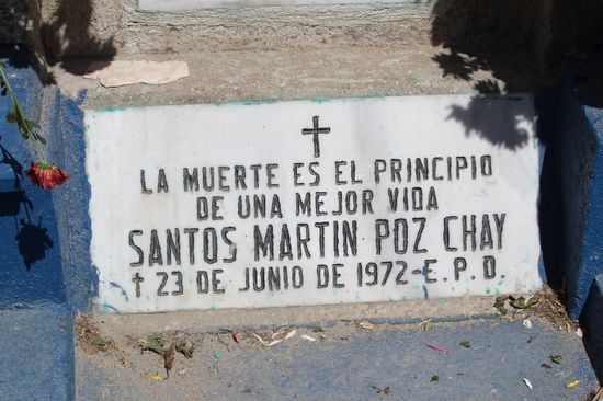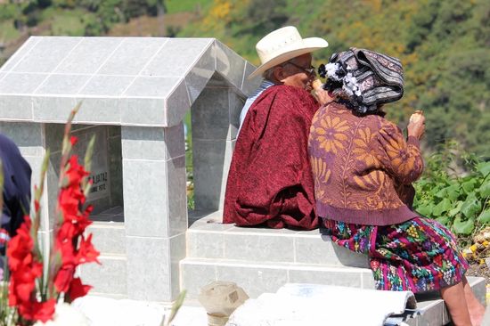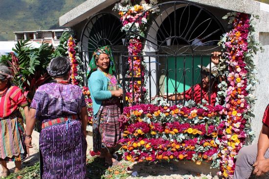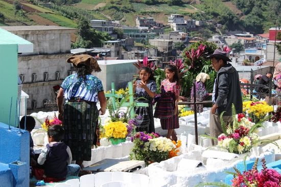 Nach zwei Stunden fahren wir weiter. In Zunil besuchen wir den Friedhof. Er liegt ganz oben, hoch über dem Dorf und ist schon von weitem erkennbar an seinen weissen und blauen Gräbern. Heute ist er voller Menschen. Sie schmücken die Gräber ihrer Verstorbenen mit den Blumen und Palmblättern, die sie auf dem Markt gekauft haben. Ganze Familien sind da.