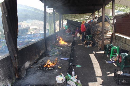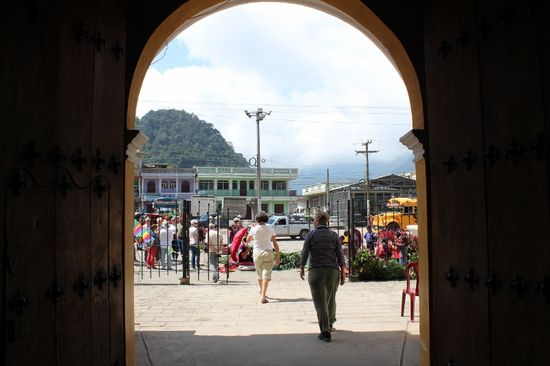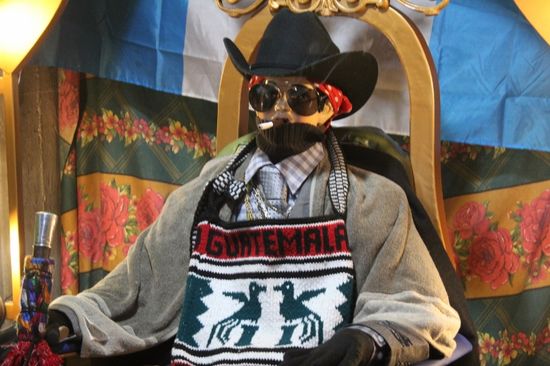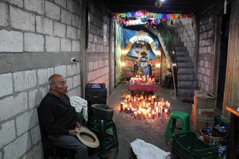 Wir kommen durch einen Markt. Hier werden Gemüse und weitere Blumen angeboten. Es ist der Dorfmarkt, Touristen findet man hier kaum. In einem Haus entdeckt René den San Simon. Dieser eigenartige Heilige, ein Überbleibsel aus der Zeit der Eroberer. Eine Mischung von Spanier und Einheimischem. Er wir in einigen Dörfern verehrt. Er wohnt jeweils für ein Jahr in einem Haus der Kongregation, die sich um sein Wohl kümmert. Er macht einen unheimlichen Eindruck, mehr wie ein Gangster, denn wie ein Heiliger. Geopfert wird ihm Geld, Zigaretten und Schnaps. Bei letzterem hilft er beim Verzehr mit. So steckt auch jetzt eine angezündete Zigarette zwischen seinen trockenen Lippen und manchmal flösst ihm jemand ein paar Schlucke Schnaps ein.