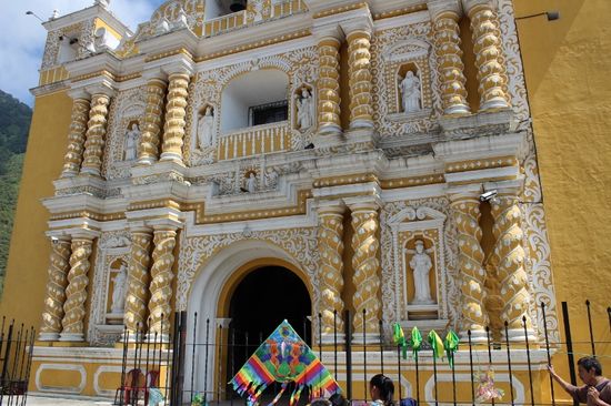 Im Zentrum besuchen wir noch die schön verzierte gelbe Kirche und kommen dann zurück zum Bus. Es ist nicht weit bis zu unserem nächsten Halt, doch die Strasse führt steil hinauf. Eine sehr schlechte Strasse, die an manchen Stellen ausbegessert wird. Das ergibt Baustellen, Zirkeln über Schotterpiste, Schlaglöcher. Unser Chauffeur braucht sein ganzes Geschick und der Blick aus dem Fenster hinunter in die Tiefe braucht manchmal etwas Mut.