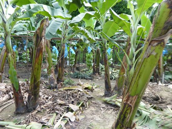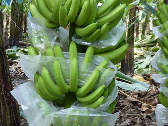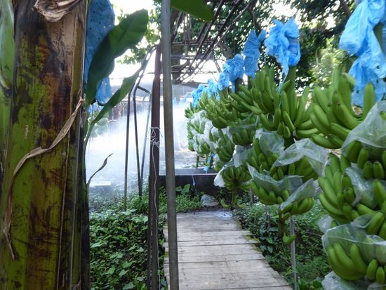 Mitten über die Strasse fährt eine Bahn, die die schweren Bananenstrauden transportiert. Den Früchten werden schon früh blaue Plastiksäcke überstülpt, in denen sie dann zu ihrer imposanten Grösse wachsen. Ausgewachsen, aber noch grün werden sie geerntet. Die Banane wächst das ganze Jahr und die Plantagen sind so angelegt, dass immer irgndwo geerntet werden kann.